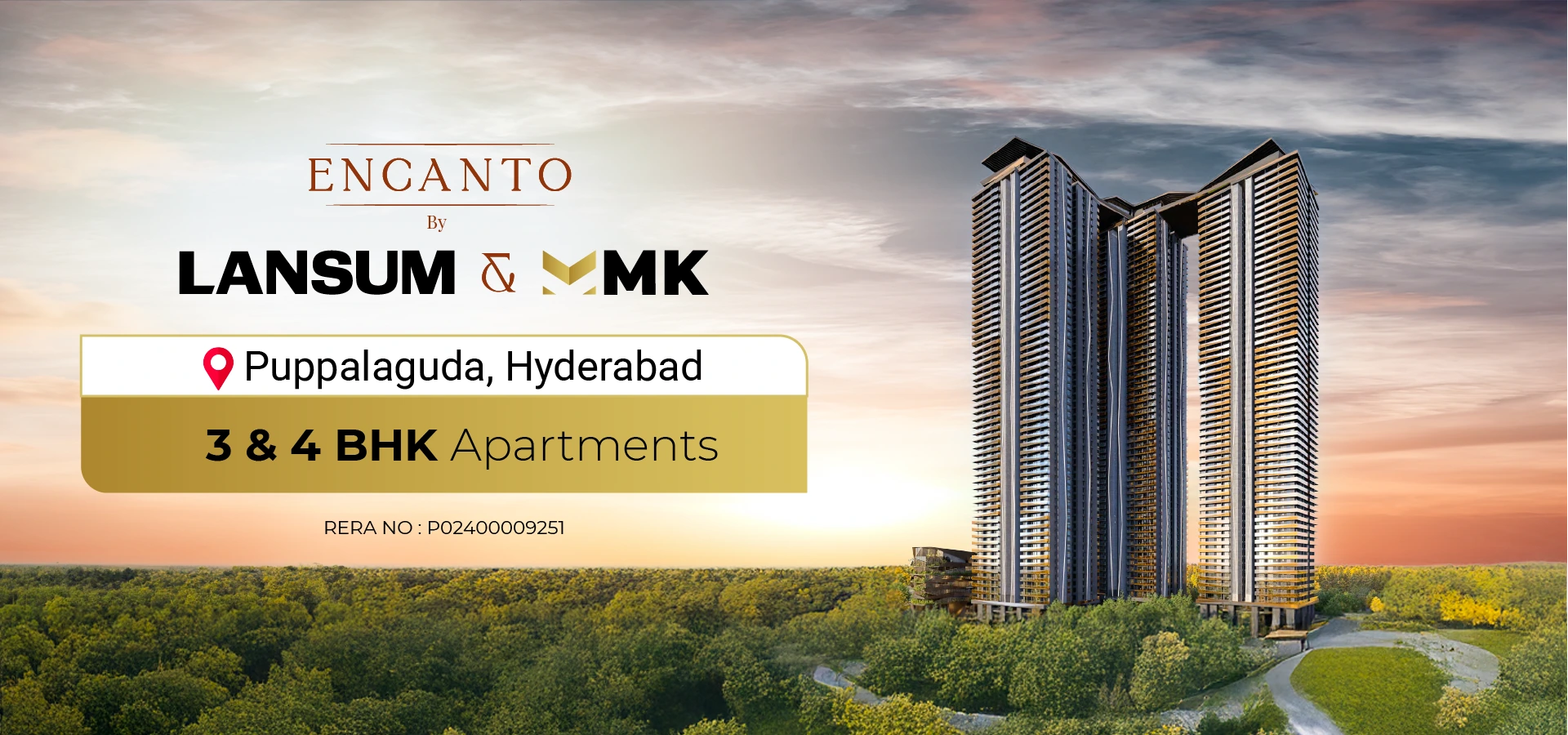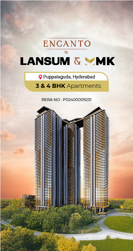 Encanto by Lansum & MK Realty is a premium residential project in Puppalguda, Hyderabad, offering spacious 3 & 4 BHK luxury apartments. Developed by Lansum and MK Realty LLP, the project features high-rise towers up to 60 floors, with homes ranging from 4,000 to 5,000+ sq.ft, starting at ₹3.64 crore. Designed with modern architecture, high ceilings, biophilic elements, and 80% open spaces, Encanto offers over 50 world-class amenities, including a grand clubhouse, swimming pool, gym, sports courts, spa, retail spaces, and 24/7 security. RERA-approved, the project is scheduled for possession by December 2029.